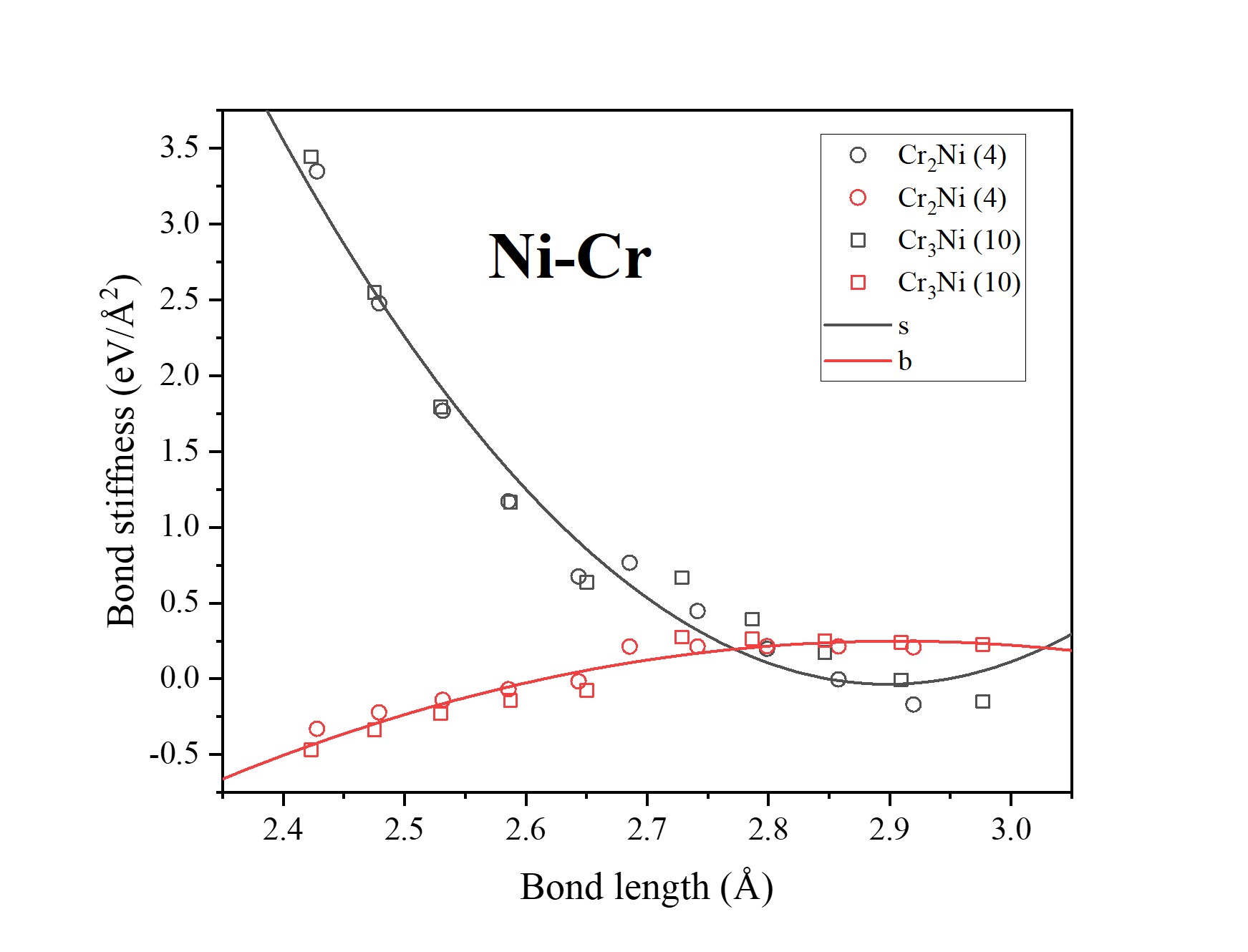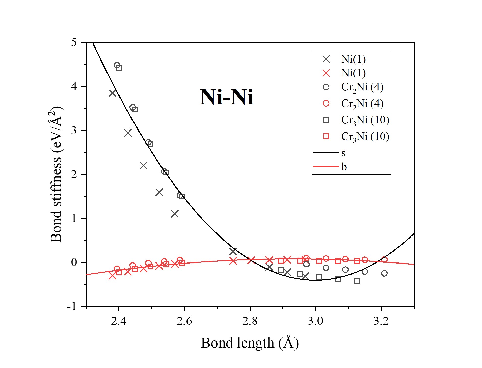 I plan to build a “slspring.out” file to determine bond stiffness vs bond length relationship for Cr-Cr, Ni-Ni and Ni-Cr. However, as shown in Figure 1 (Cr-Cr bond), Figure 2 (Ni-Ni bond) and Figure 3 (Ni-Cr bond), the Cr-Cr bond cannot be described by one formula over the entire bond length range. For example, in stretching terms, two formulas are required to describe the relationship for the 1st nearest neighbor (distance from 2.3 to 2.7 Å) and the 2nd nearest neighbor (distance from 2.7 to 3.2 Å), respectively. A similarly situation occurs for bending terms. This means that slspring.out file should be described as follows: