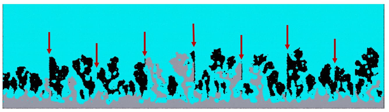 I use LAMMPS (SPH Package from the 8 April 2021 version) for modeling electrodeposition and I am currently attempting to implement a connectivity check of particles. My system has a type 1 and type 2 particle. As the simulation cycles some type 2 particles will break off from the origional portion of type 2 particles and become isolated (i.e. surrounded by type 1 particles). I am using a breadth-first search in order to determine the connectivity of particles and this seems to work properly within each processor domain. However, when communicating with other processors, there seems to be an issue. The code is below and the issue can be visualized in the attached image. The biggest issue is that the boundary particles are all being turned to type 3 when they shouldn’t be.