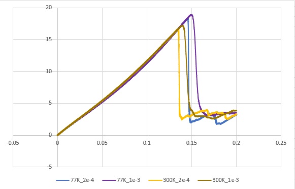 These are the tensile results I got from it at 77K and 300K with the strain rates of 2e-4 and 1e-3.