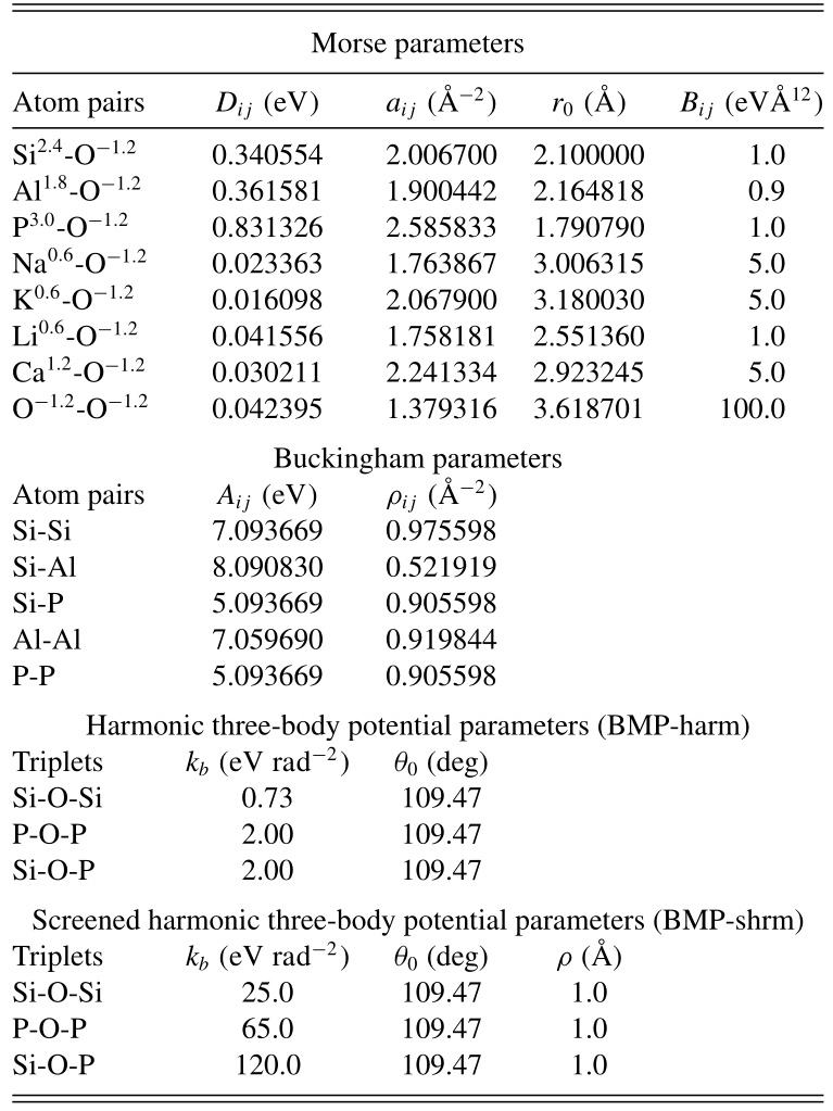 I would like to implement the improved Pedone potential in LAMMPS (https://doi.org/10.1103/PhysRevMaterials.5.045602), referred to in the literature as BMP. I am currently using the original potential, referred to in the literature as PMMCS (https://doi.org/10.1021/jp0611018), which I have implemented without problems since the LAMMPS release of April 17, 2024. The enhanced potential contains the parameters for the Pedone potential for binary oxides, the Buckingham potential for interactions between identical atoms, and also includes terms related to the Harmonic three-body potential parameters (BMP-harm) and Screened harmonic three-body potential parameters (BMP-shrm).