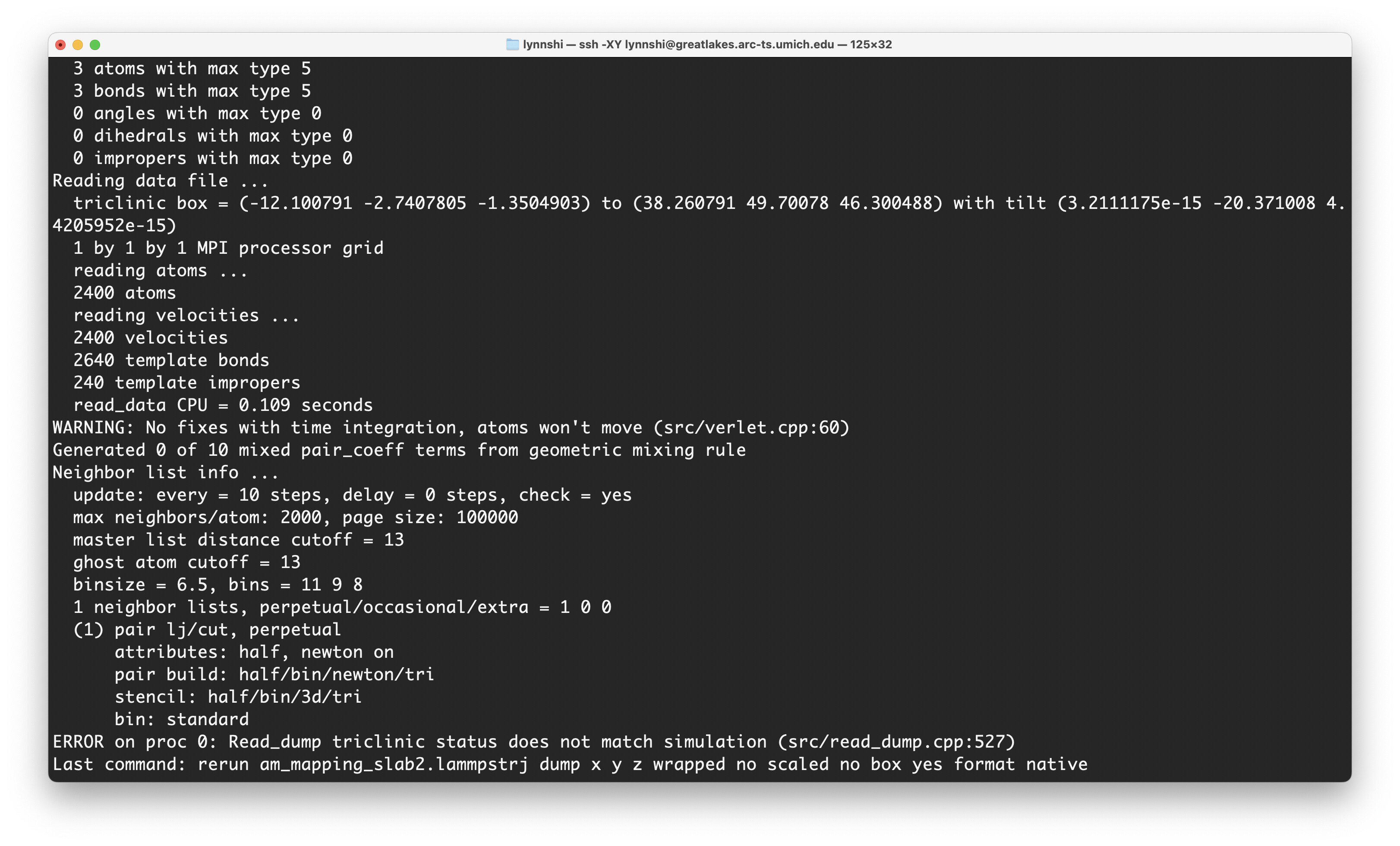 I’m trying to use rerun command to do single-site calculation, namely using a different set of parameters to calculcate forces based on existed trajectory. My package is lammps/02Aug2023. But when I tried to do the rerun, it keeps giving the error Read_dump triclinic status does not match simulation.