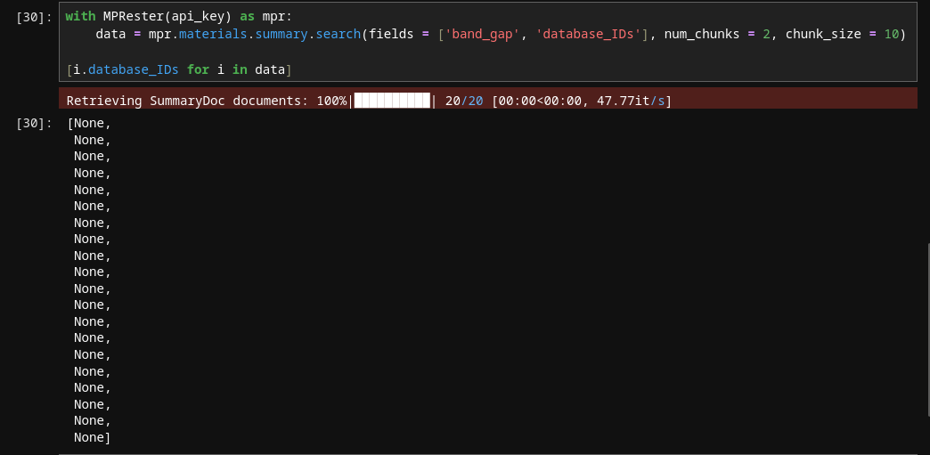 Hi everyone, I noticed this a few days ago; MPRester queries requesting database IDs are not returning them as they used to. The code snippet below shows the response to one such request. For the project I’m working on, I need the source database IDs of materials. Any help is appreciated.