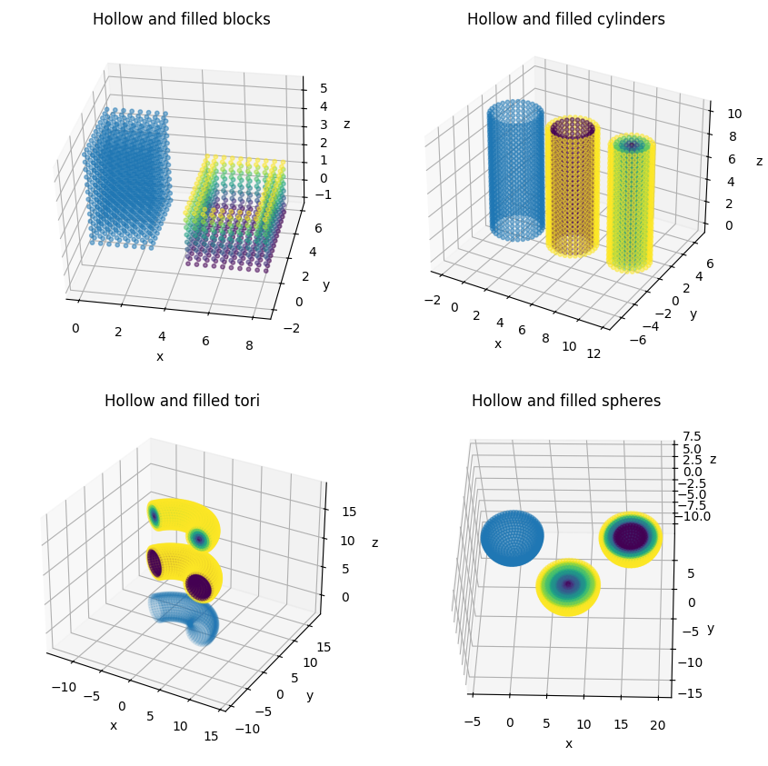 3D geometries (blocks, cylinders, tori, and spheres):