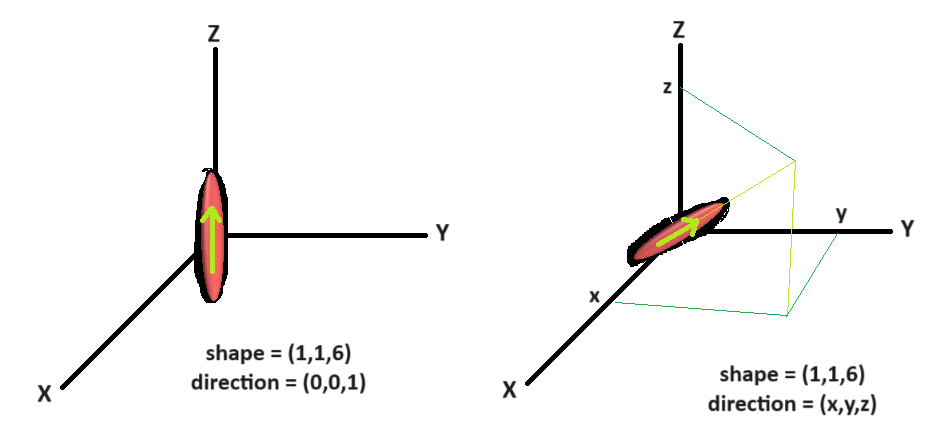 Dear all, I have created an ellipsoid with its shape (1,1,6) as shown. I would like to make its tip to point to the direction (x,y,z). I was wondering how to define quatw, i, j, k.