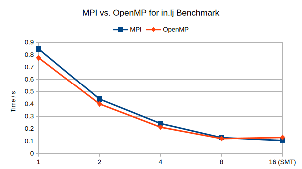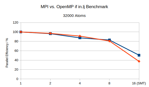 OpenMP is a little bit faster in absolute performance, since the OpenMP version of the pair style has some additional optimizations that are missing from the base style. Parallel efficiency is almost the same, only when using the SMT threads thing start to break down. In this case OpenMP works quite well because the system is so small that the data fits to more than 50% into the per-core L2 cache and all data into the global L3 cache.