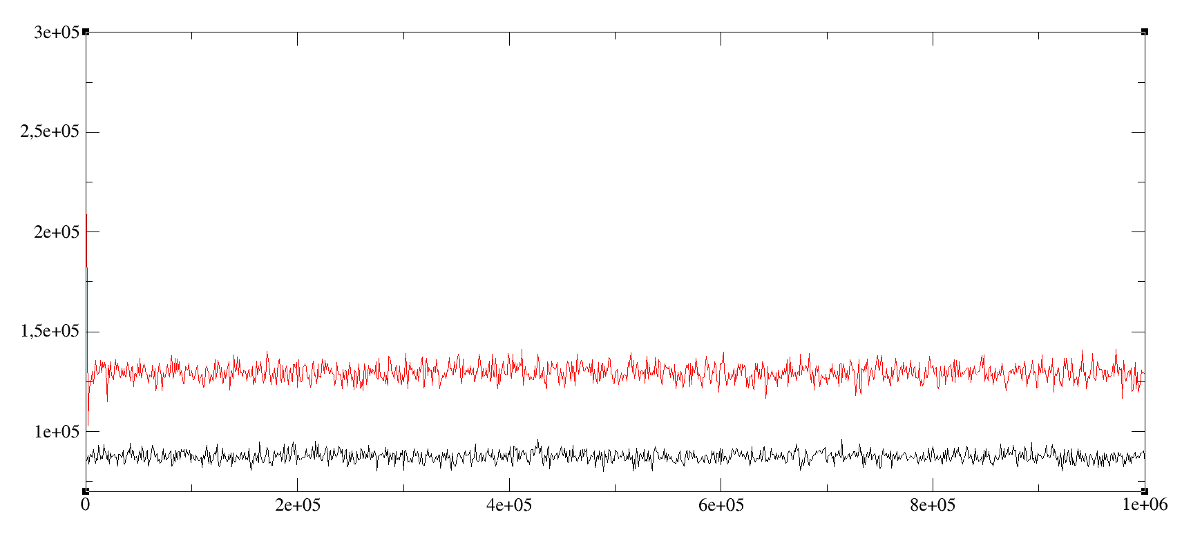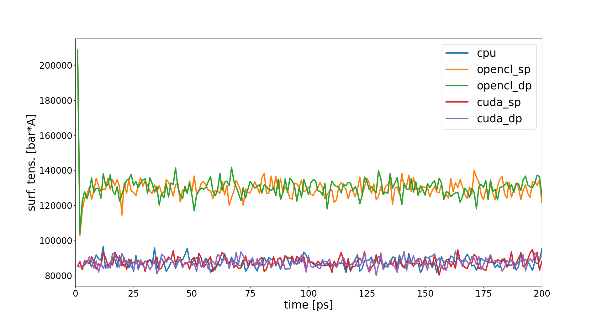 I am in a hurry so I forgot to put labels: y-axis is surface tension [bar*Å], x-axis is the frame (multiply by 0.001 to get the time in ps), red is OpenCl and black is CUDA.
