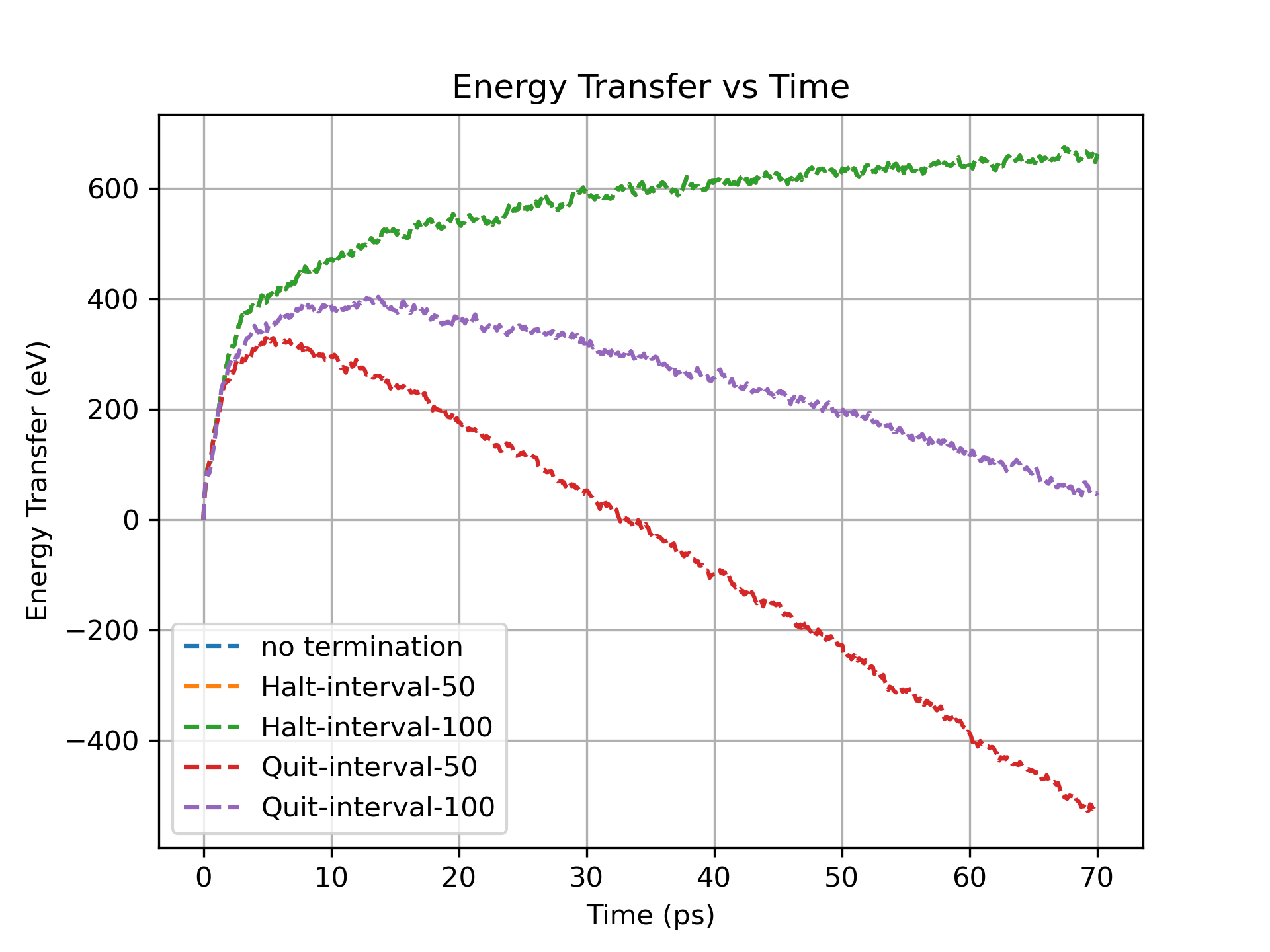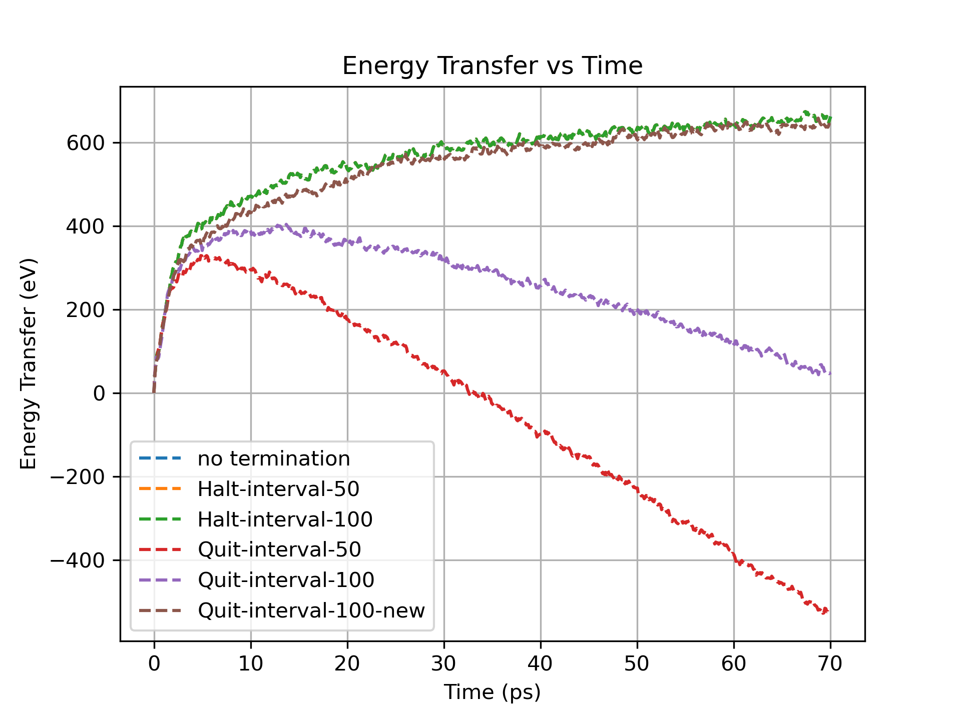 I added a plot. In this plot, ‘Quit‘ represent the first method, ‘Halt‘ represent the second method with ‘fix halt‘, the numbers represent the checking frequency (50 and 100 timesteps), and ‘no termination‘ represents running simulations without termination condition.