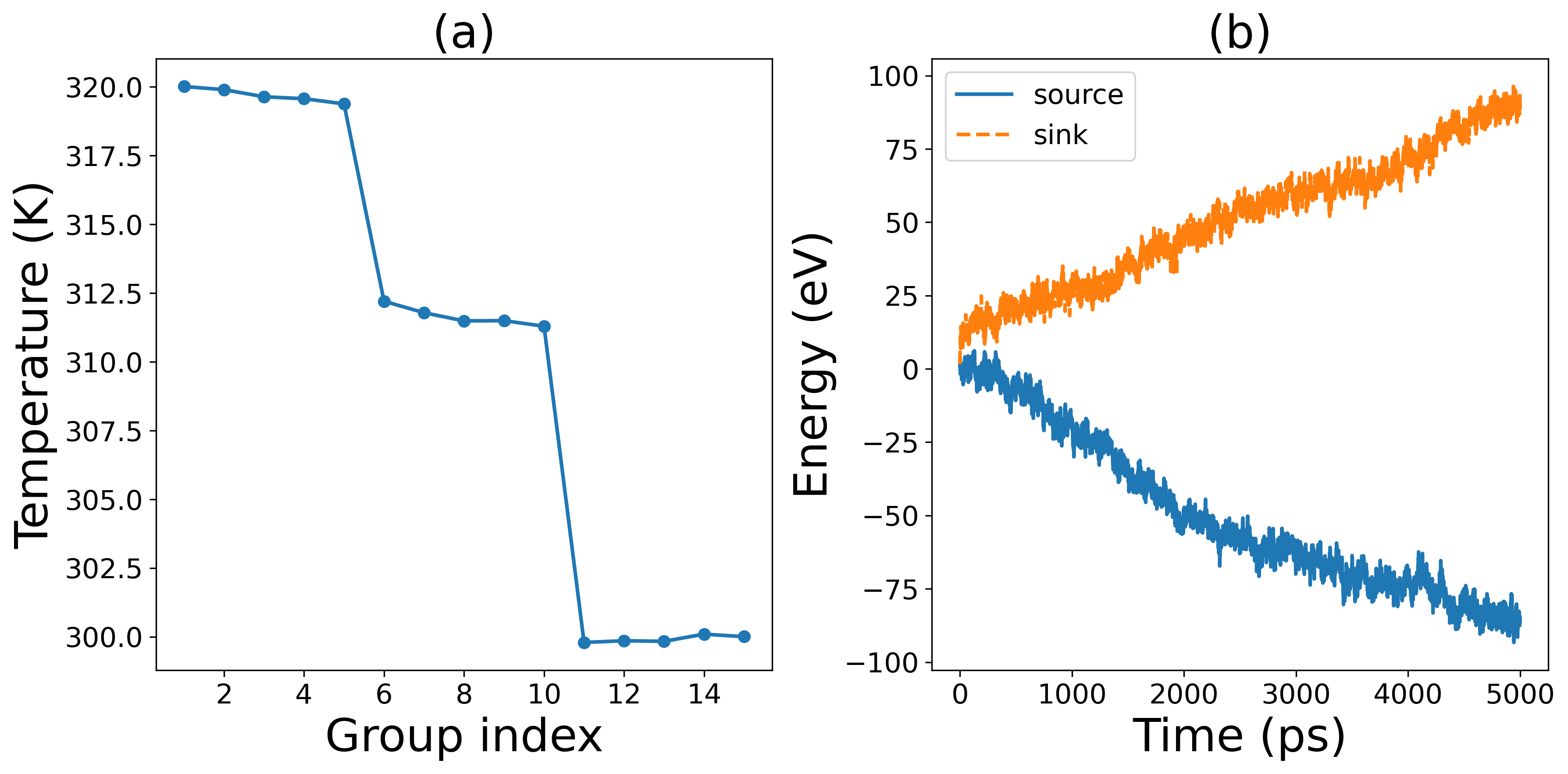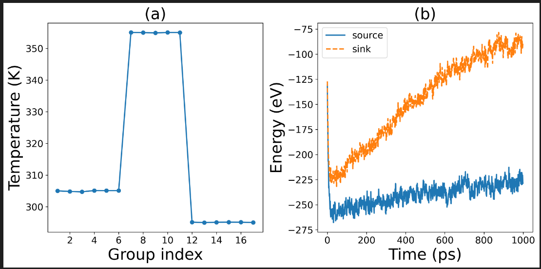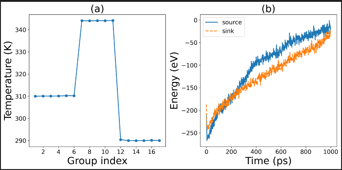 Hello professors and experts, I have improved the NEMD input parameters by using timestep=0.5, a relaxation time of 1 ns, and a calculation duration of 5 ns. The resulting temperature and energy graphs show some improvements. The final interfacial thermal conductivity was determined to be 4 MW/m^2*K. Although there are few references using GPUMD to calculate this interface property, by comparing with other methods and materials, I estimate that my calculated value is about an order of magnitude lower than the ideal value. I checked the calculation formulas and found no errors. Could it be that my potential function is not accurate enough? What should I do?