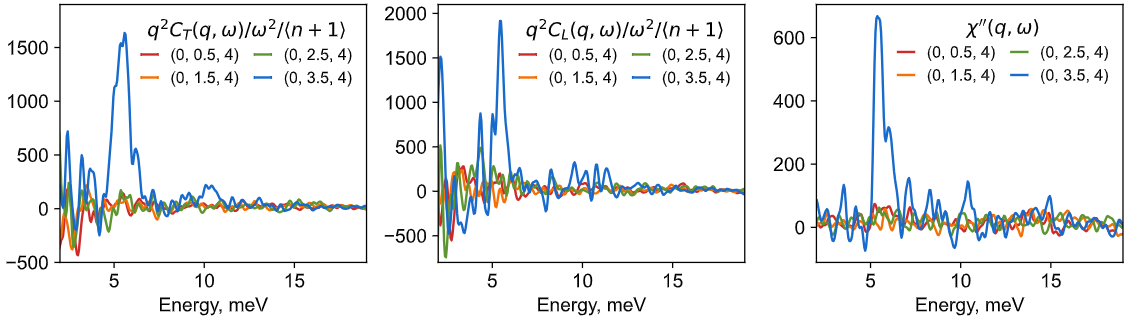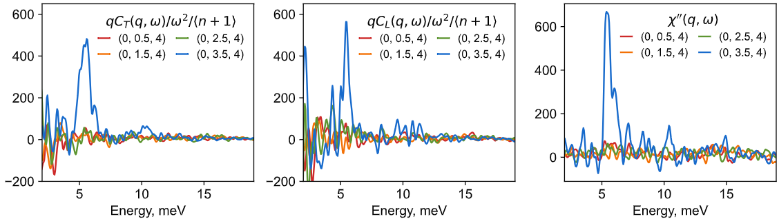 I am attempting to reproduce some of the calculations related to transverse acoustic modes in this paper (their figure 3f in particular) using dynasor. Numbered equation 1 in the dynasor 2 paper relates the dynamic structure factor to the longitudinal current correlation function exclusively: w^2 S(q,w) = q^2 C_L (q,w). I am puzzled by how the first paper claims to simulate the dynamic susceptibility for transverse modes from the structure factor. It would make sense for the dynamic scattering factor to contain both longitudinal and transverse modes, because neutron scattering probes both polarizations. I also tested the above equation from my own simulation analyzed with dynasor, and did not obtain correspondence between spectra of S and C_L versus frequency at specific q-points, although there is approximate correspondence in overall spectral shapes. In my ideal world, I would be able to reconstruct the longitudinal and transverse components of the dynamic structure factor separately. What am I missing, or what could I do to troubleshoot?